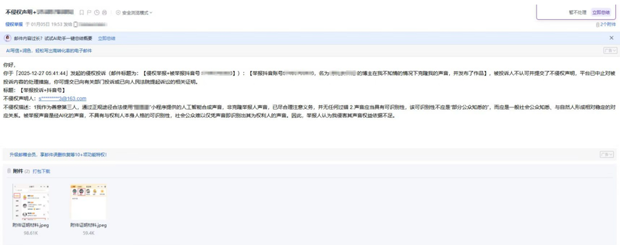 有人建议他向抖音邮箱举报,可能会比站内举报管用。他在提交双方信息的同时,还上传了朗读对方账号视频中文案的音频,想以此证明那些都是自己的声音。短视频平台对部分账号判定“存在侵权行为”,下架相关作品并对账号作出处罚。