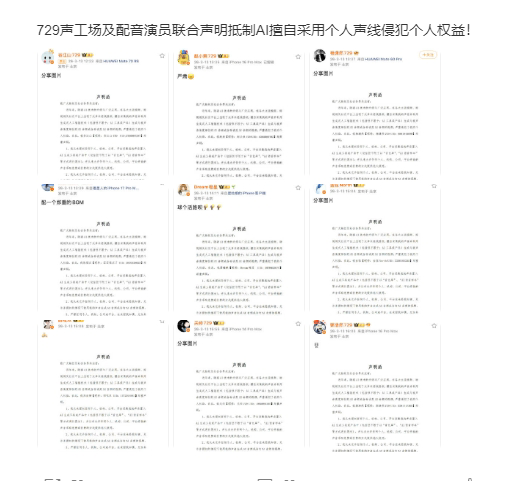 3月13日,国内知名配音公司729声工场旗下多位配音演员发布声明,抵制利用AI技术进行侵权的行为。3月16日晚,曾在《哪吒》系列电影中为“哪吒”配音的配音演员吕艳婷也加入行列,公开发声抵制。短短数日,已有数十名配音演员就AI声音侵权行为发文声援。